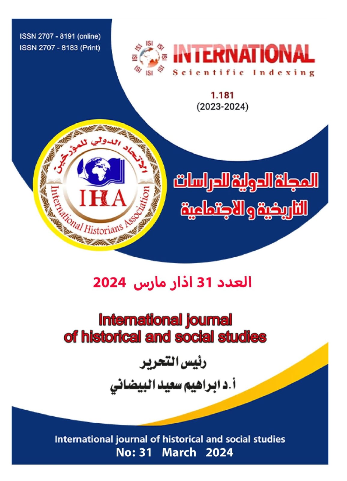 الاتحاد الدولي للمؤرخين تحمل رقم دولي. ISSN:2707-8183 تحمل عنوان المجلة الدولية للدراسات التاريخية والاجتماعية.