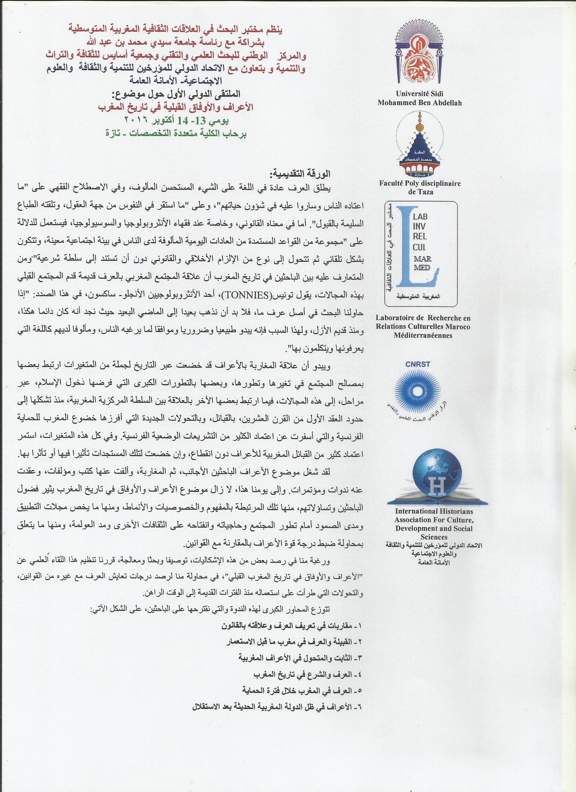 fiche-de-participation-au-colloqueالندوة الدولية بعنوان : الأعراف والأوفاق القبلية في تاريخ المغرب تنسيق ذ. لحسن أوري الورقة التقديمية: يطلق العرف عادة ... اقرأ أكثر